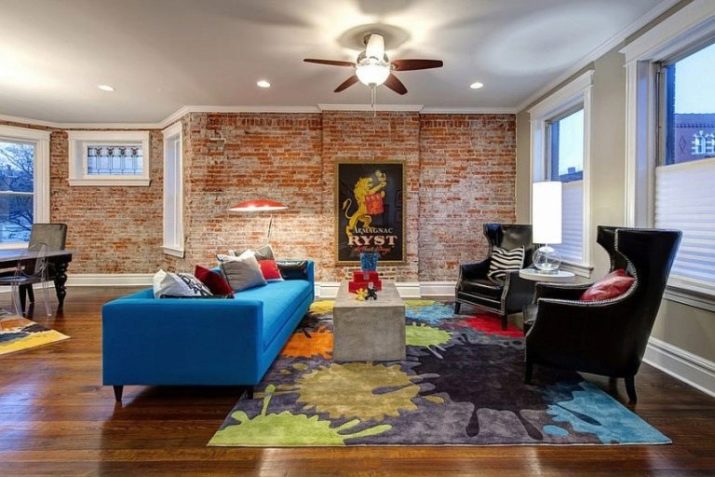 - Bright palette. This is a very bold design option, so you need to carefully select the details and correctly combine the colors. A good example of such a dynamic and warm design is the combination of a blue sofa against the background of vanilla-colored wallpaper with bright red and orange details in the form of pillows, floor lamps and paintings.