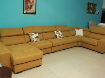 Designers have come up with many different additional items that decorate the interior. For example, coffee tables, built-in shelves or a bar, poufs in the style of the sofa itself - all this harmoniously looks in combination with a huge corner sofa, and it also adds storage areas.
