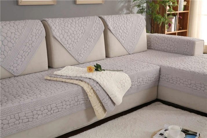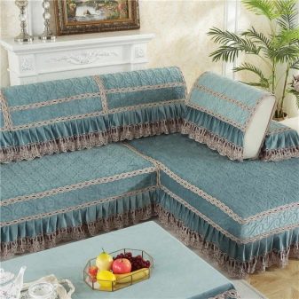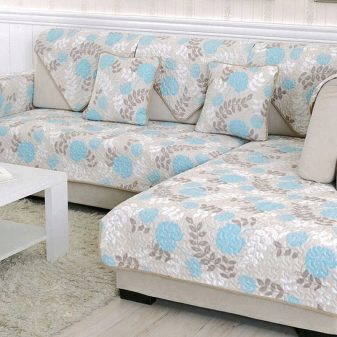 There are several types of bedspreads for corner models, and all of them have certain features. So, One-piece bedspreads can be purchased for those sofas that do not have armrests. They can repeat all the bends of the corner. Most often, such models of wraps have an anti-slip coating, which allows you to relax in comfort. The set can even be picked up on a sofa without a back.