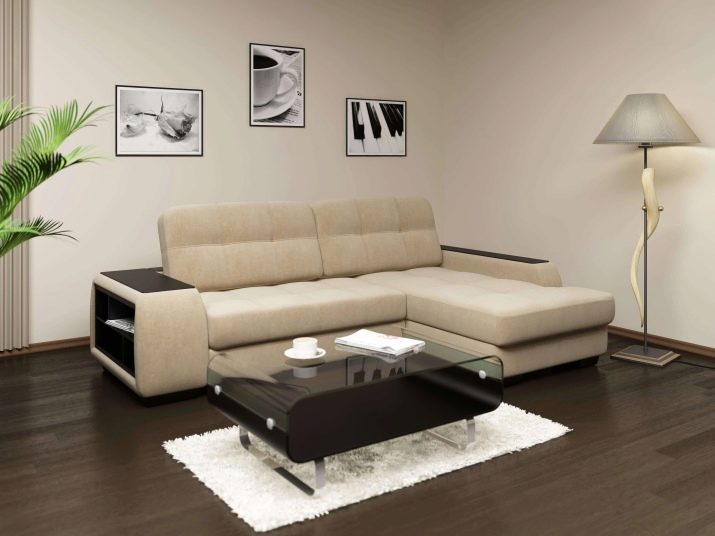 The photo shows a simple corner sofa in a modern style. Its attractiveness is emphasized by the adjacent glass table. Discreet colors look quite good. It turns out to be logical and the side cabinet adjacent to it. The combination of a light sofa and a dark floor is chic.