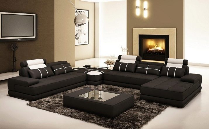 Sofas in a modern living room can be in dark colors. In this case, they are arranged around a central table and a dark gray carpet. The pure white floor creates an expressive contrast. The fireplace in the background helps to emphasize the quality factor and solidity of the designer's ideas. The combination with other decorative elements of the room also looks good.