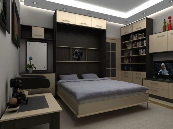 - In the daytime, a bed in a similar design can be removedand the furniture will take on a completely different look. Its functionality will also change. At the same time, households will not face the loss of useful space in the room.