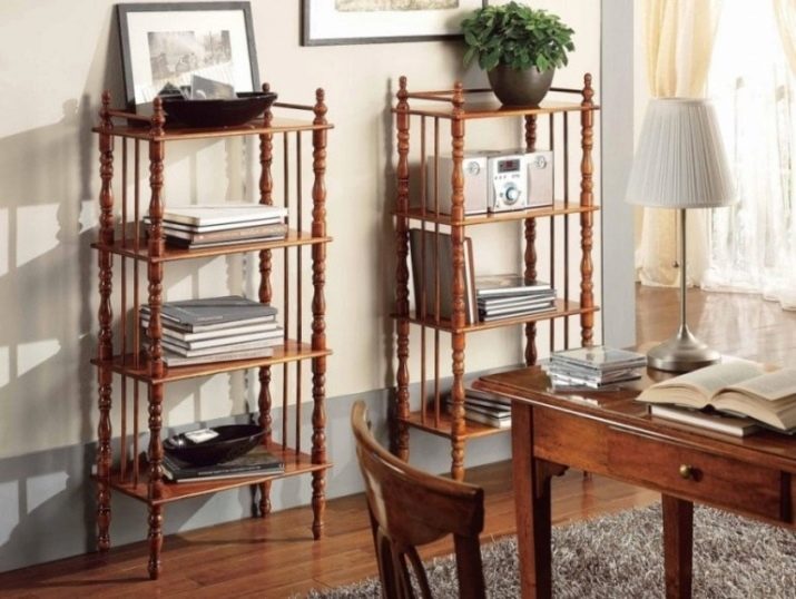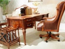 If it is planned to arrange carved furniture in the office, but do not want to overload the space with dimensional elements, then instead of heavy cabinets you can buy light shelving. The beautiful natural color of wood, identical to the shade of the desk and chair, combines all the furniture in the room into a single composition.