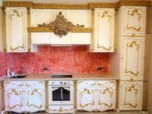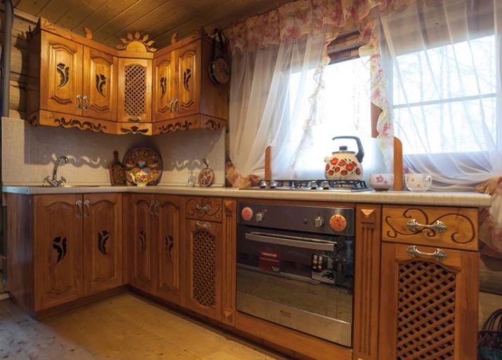 A carved set is also suitable for decorating the kitchen space of a country house. With this technique, in this case, only the facades of the cabinets are decorated, but thanks to the variety of carvings, the finished solution looks very unusual. Present on it and slots of various shapes, and volumetric figures, and flat details resembling platbands.