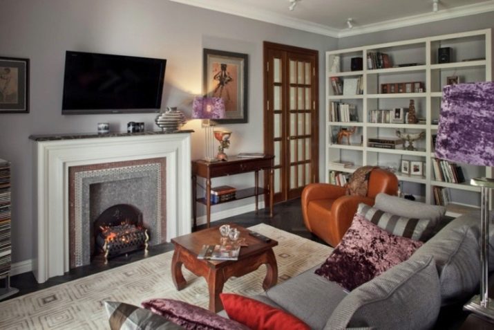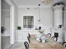 He does not “argue” with a fireplace with mosaic trim, a carpet with geometric patterns, as well as a bright lilac floor lamp. In addition, despite the variety of colors and textures in the room, it’s a simple wooden table immediately catches the eye, becoming the center of the composition.