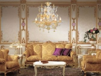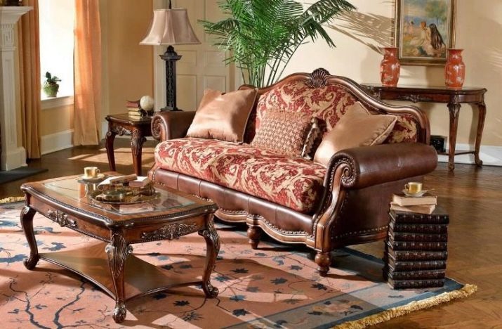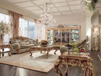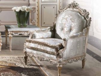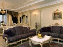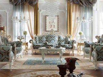 To decorate the living room a carved coffee table, armchairs and sofas, the armrests and legs of which are decorated using curly processing, are well suited.
