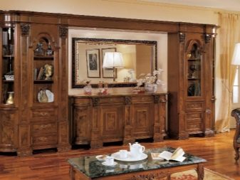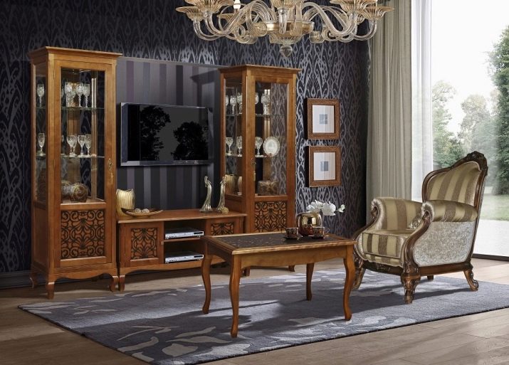 Very often carved furniture is used for the design of the living room - the main room in the house or apartment. A set made of solid dark wood and decorated with discreet elements, “Sets the mood” for the whole room. It immediately becomes clear that the owners are quite conservative people with good taste, balanced and appreciating comfort.