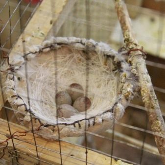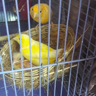 Canaries are sexually mature when they turn one year old. The breeding season is in the spring season. It is mandatory for feathered birds to install a special nest in the cage (worth buying at a pet store), and also to give along with it all the necessary building materials: hay, pieces of paper napkins. A couple of weeks before the nest is installed, the birds should begin to give a boiled egg with carrots and an admixture of crushed chalk every other day.