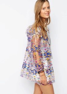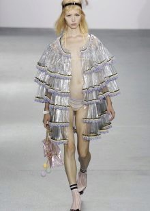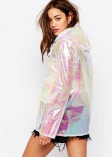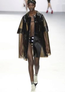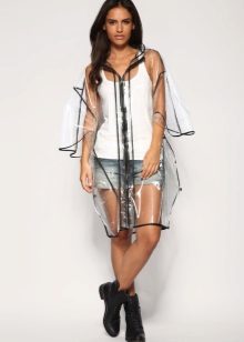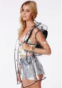 - A short raincoat is perfect for the summer. Especially it will be appropriate at a music festival - if it suddenly rains, you can continue to enjoy the performance of your favorite band. Please note that the raincoat must be selected so long that all clothing is securely hidden. In this case, a good choice of short shorts and a basic white t-shirt. The image is complemented by baubles and baubles and a wreath on the head.