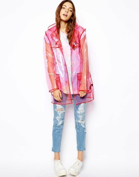 - A pink vinyl raincoat park will cheer you up on a rainy fall. So that there is no dissonance between your chosen clothes and a raincoat, give preference to a neutral color scheme. Light blue jeans, a white T-shirt, and sneakers are perfect.