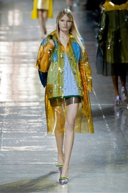 - Another great choice for rainy fall days. Designers love to experiment, so this season they offer us not only the outerwear of their polyethylene, but also hats, sweaters and even skirts, as in this case. A pair of her is a warm blue sweater with a green trim. The image is complemented by a bright yellow raincoat and lilac boats. Stylish eclecticism for every day and for a special occasion.