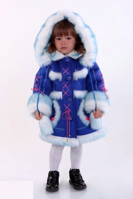 Charming model for a little princess. The flared bright blue sheepskin coat of the bell silhouette is decorated with pink lacing on the sleeves and along the fastener line. The highlight of the model is a snow-white fur trim on the collar, chest, sleeves, along the hem of the product.The voluminous hood beautifully frames the face of the girl and provides the baby head with additional protection against the vagaries of the weather.