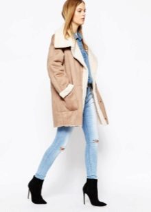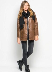 Warm slightly flared trousers, jeans and leggings work well with a short faux sheepskin coat. Her tandem with a volume scarf (snood) or a modern shawl will look great. Boots should have a high top. You can also choose neat ankle boots.