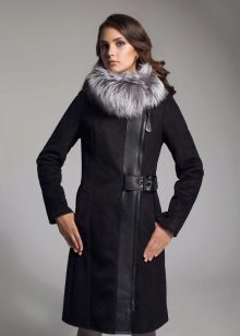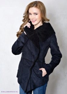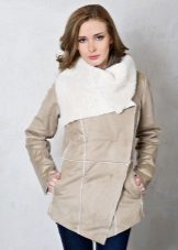 - A double-breasted sheepskin coat with a wide collar and an asymmetric hem this winter will be quite popular. It is harmoniously combined with jeans, trousers or a skirt. To complement the image, you can wear a wide scarf or snood.