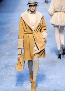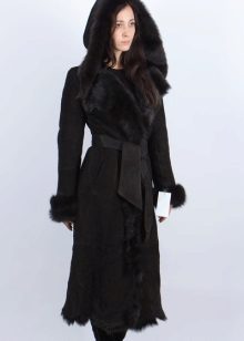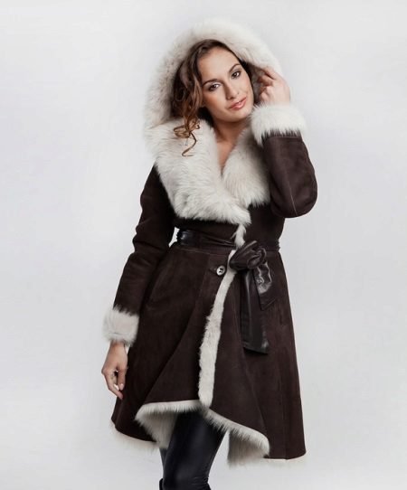 - A long sheepskin coat with an A-shaped silhouette, a wide belt and a voluminous fur hood will look good on any figure. It can be worn with jeggins, tight-fitting trousers and even a tight skirt.