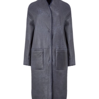 An incredibly fashionable sheepskin coat with a straight cut keeps one more secret - a two-sided model. And if one side is made in a “leather” version with a minimum of details in a beautiful gray color, then the second side will please with an unusual “fur” look of sapphire color, and the same cut details look like a new model. Shearling coat of a straight cut, medium length, without a collar with a V-neck of a neck in the form of a rack, on buttons with a long sleeve and a belt. The sleeve line is slightly lowered, which, in combination with the neck, looks very harmonious. Patch volumetric pockets with a clear geometric shape give the model an ultramodernity. Fur patch pockets are made of sheepskin with a long pile and in another color - gray.