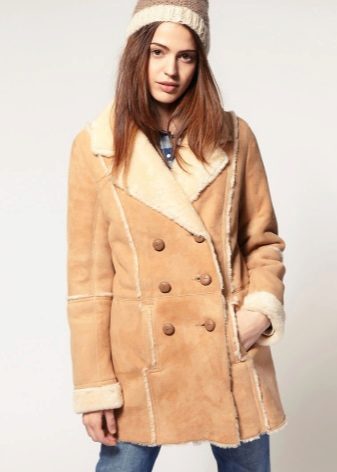 A separate place is occupied by military style sheepskin coats such as a pea jacket, uniform or frock coat, characterized by double-breasted, collar. additional decoration in the form of shoulder straps, loops, stripes. These models can be straight cut or slightly flared from the waist.