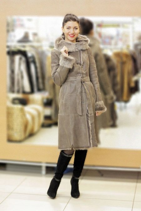 - A knee-length sheepskin coat made of coffee shade with milk has a fur collar and fur collars. Large round buttons look restrained, but beautiful, and the addition of a belt from the same material will be very useful. Pick up high suede boots with heels, as well as unobtrusive accessories in the form of a woolen scarf around your neck, a small handbag and elegant gloves, and you will not be equal.