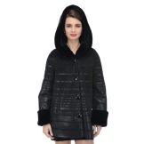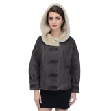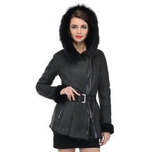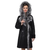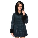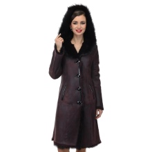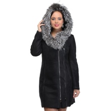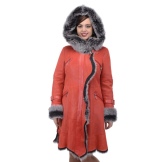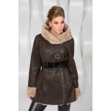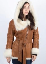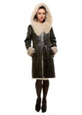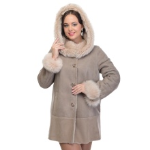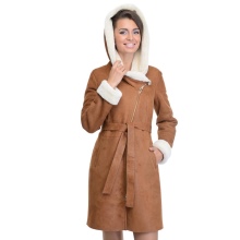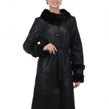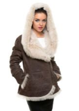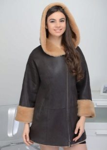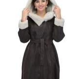 Free trapezoidal sheepskin coats with a length up to the middle of the thigh fit any figure, emphasizing the femininity of the silhouette. Often the model is supplemented with a hood with fur trim, which is also present on the sleeves.
