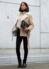 A short sheepskin coat in biker or aviator style will help you create a trendy look. With her you can combine both your favorite jeans and a feminine floor skirt. Try only to avoid unisex-style clothes so you don’t look rude. Black leather trousers will stylishly and defiantly look with a black model.
