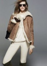 In winter, a short white sheepskin coat looks stylish. Moreover, the bottom of any color is suitable for it. Such a thing looks spectacular with a hat and scarf of the same color, decorated with ethnic or floral patterns.