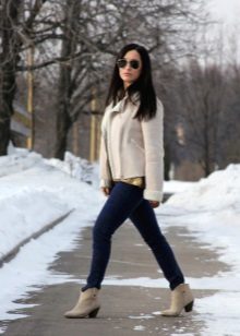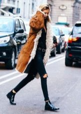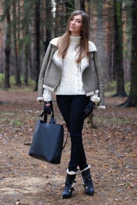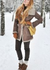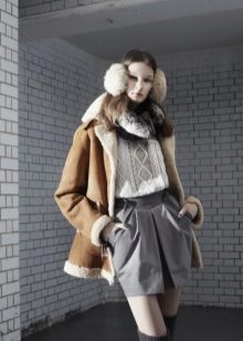 A sheepskin coat with an imitation of a jacket on top of it looks spectacular. The perfect complement to create an image in grunge style will be boots, an unusual hairstyle and a backpack on the shoulders. Sheepskin coats in this style can be mini or midi lengths.