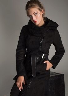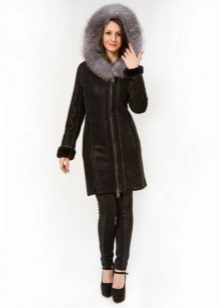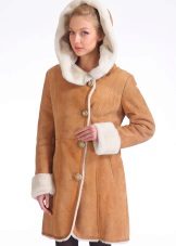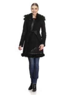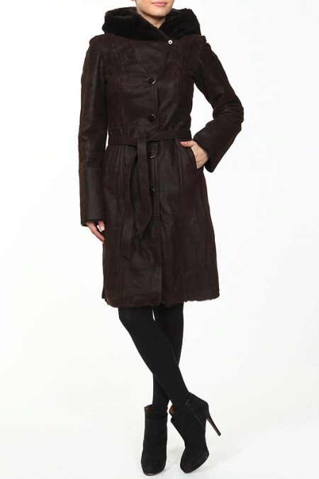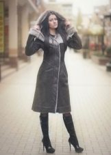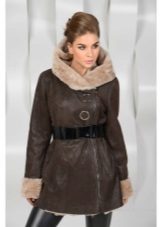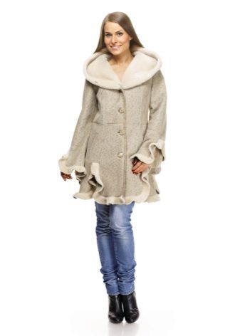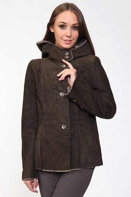 An equally popular model is a sheepskin coat-coat or trench coat. It is performed in different lengths, most often medium or shortened. Such a sheepskin coat looks especially impressive if a thin sheepskin with a short sheared fur is used for sewing it. The model is complemented by a wide, voluminous hood and patch pockets on the sides. This style is considered ideal for creating an everyday urban image. Sheepskin coat is perfectly combined with jeans and trousers of different styles.