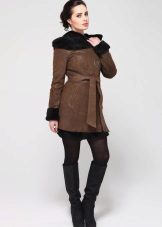 A classic medium-length sheepskin coat is perfect for matching with a skirt or dress. The model is made in a noble dark brown shade and complemented by an elegant belt. Elegant sheepskin boots with a high stiletto fit perfectly under such a sheepskin coat.