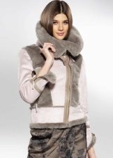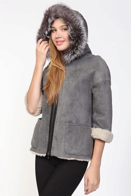 A shortened sheepskin coat with sleeves ¾ is perfect for auto ice. The light gray sheepskin coat is decorated with an edge of the silver fox. This model can be combined with a turtleneck or sweater with a long sleeve, or wear long leather gloves under it.