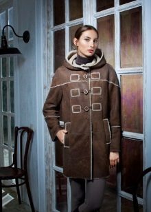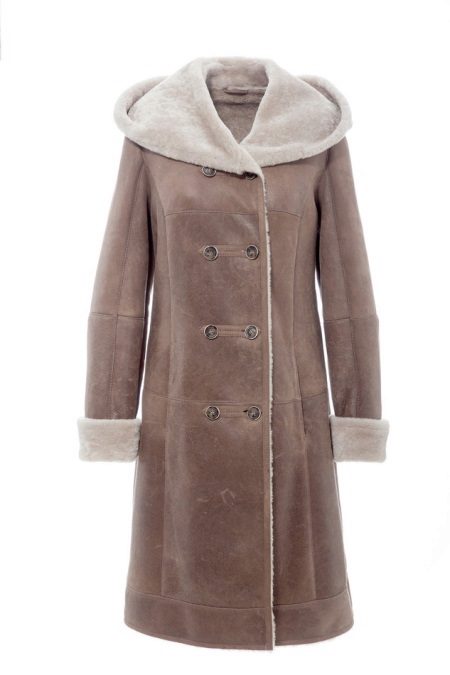 A light brown sheepskin coat of a free cut, complemented by a wide hood, and made of Spanish Merinillo fur, will suit ladies with any figure. This is a sheepskin coat of an extremely delicate brown hue. Due to its maximum length, combining this product with other clothes is very easy. The cuffs and the collar are made of light fur.