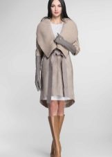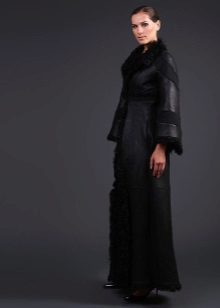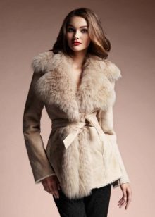 The wide sides of the sheepskin coat are wraparound and secured with a wide belt. In this model, the emphasis is on the waist, and the emphasized thin waist, in turn, draws attention to the luxurious feminine hips and chest.