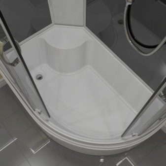 A cabin that has an asymmetric shape. Size 120x80 cm. The pallet is high, the rear pillar is made of tinted glass, there is a roof. In the complete set there is a shelf and a mirror.