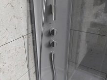 The equipment tray is durable, made of artificial marble, contains a built-in hair trap in the drain hole. Included are lightweight sliding doors, profiles in white or silver. The glass in the booths is transparent, but you can install transparent glass in the front, frosted in the back. The cabin height reaches 215 cm (with the possibility of adjustment up to 8 cm). Door handles are very durable and easy to use.