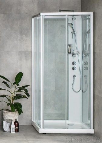 Showerama - The name of the Scandinavian shower cabins equipped with a built-in thermostatic mixer. They have many advantages and almost no shortcomings. The cabins are durable, made of high quality materials, have a beautiful appearance and are very convenient to use. The equipment is equipped with a hand and rain shower, steam generation function. In the shower there is a spacious shelf for things, you can also install additional ones. Mounting models is fairly straightforward, including securing the mounting tabs and collecting aluminum profiles. Installation instructions included.
