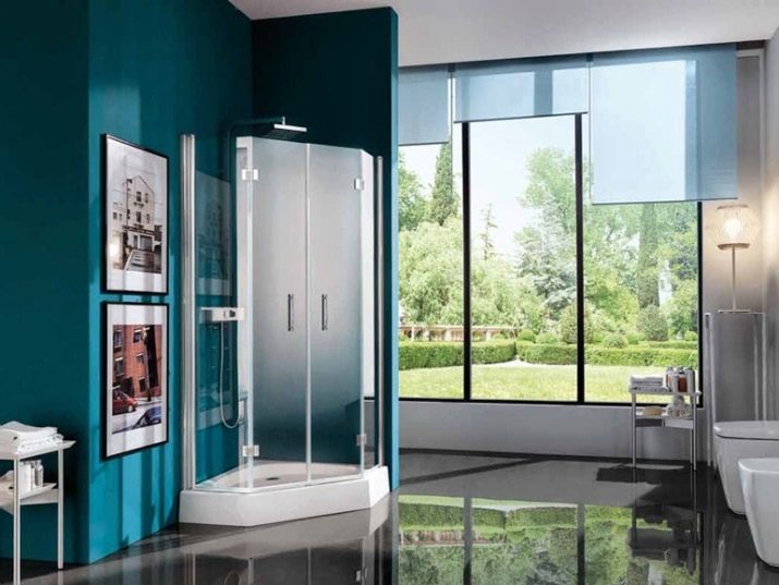 The joints of the glass faces are made in such a way so that moisture does not leak through the connecting seams. Two main vertical joints connect two main walls and two others directly adjacent to them. The central part of the external shower enclosure is adapted for a door through which you can enter. In most cases, a pentagonal shower installed in the corner of the room. The two walls with the largest area are retracted to the junction of the two walls of the bathroom. Two other walls are attached perpendicular to the edge of each of them. The door is mounted in the center.