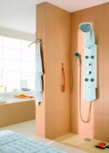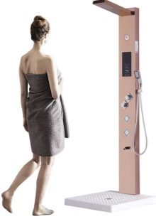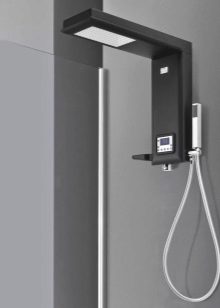 Inside, the panel for the shower cabin is equipped with a mixer, on the surface you can see only the valves and showers regulating the heat and pressure of water. More advanced models are equipped with a thermostat, which automatically controls the temperature of the water, models of reputable manufacturers suggest touch control. A molded case in the form of a panel holds a hand shower with a hose, an overhead shower, a mixer and hydromassage nozzles.