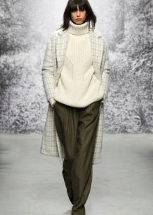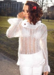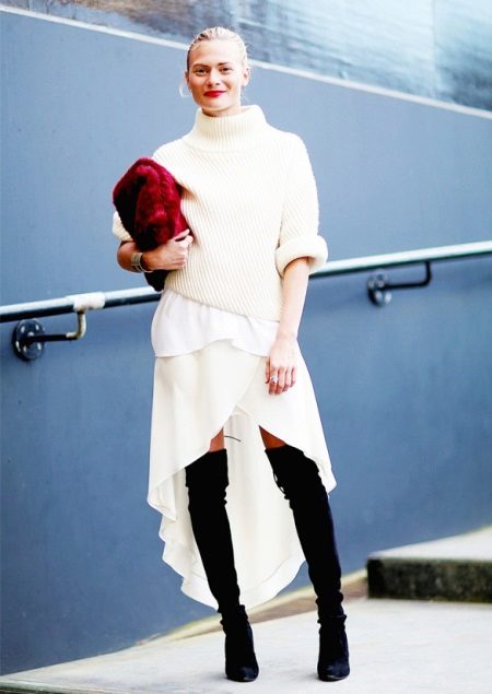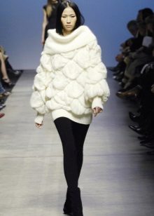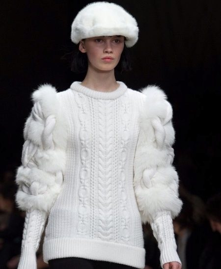 - Combined models. Designers suggest combining knitted white jumpers with fabrics and fur. For example, a classic-length jumper is combined with fur, which adds sophistication to the model.