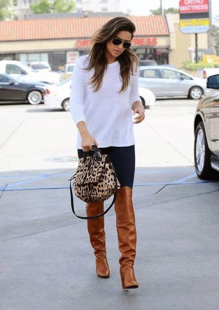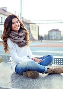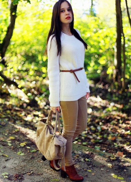If you prefer minimalism in details, brown skinny jeans in a dark color and a white jumper will be a good duet. Country-style boots or ankle boots will complete your look.