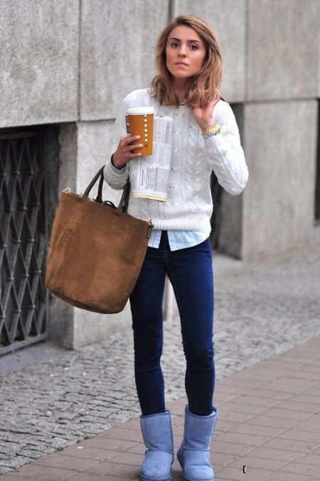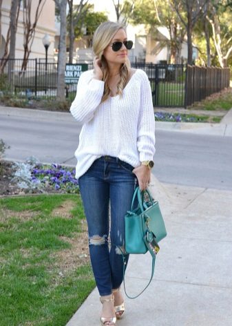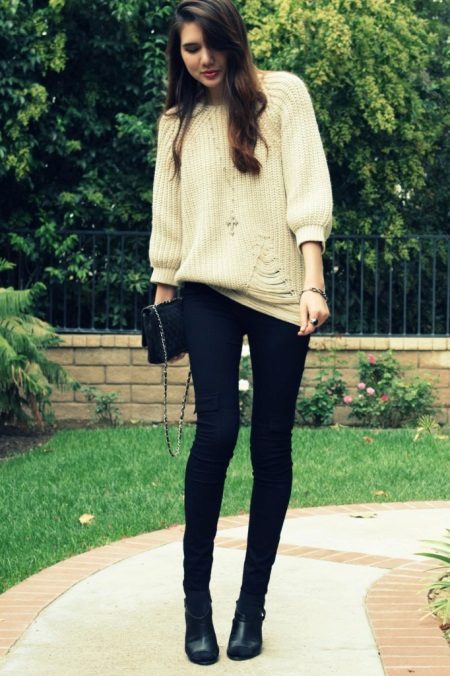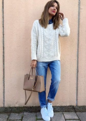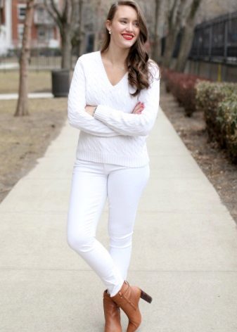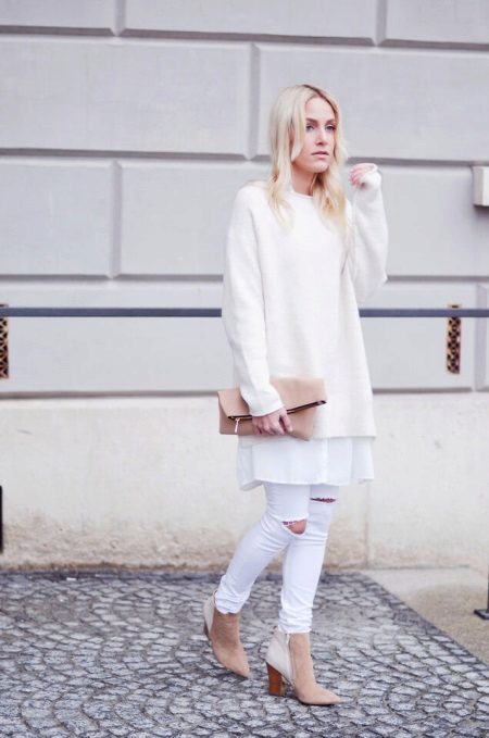 A white jumper is a universal thing. Therefore, the choice of shoes depends on the style of clothing. So for an oversized model, leather or suede ankle boots will be a good duet.