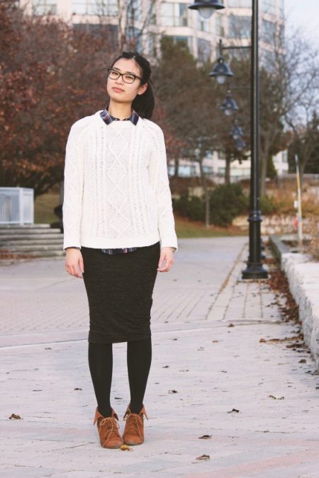 A classic look and a plaid shirt and brown shoes will turn your office look into everyday wear. To add clarity to the lines, select black tights and a black pencil skirt.
