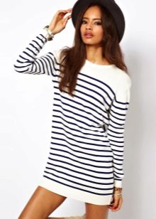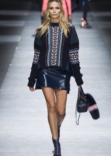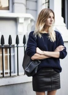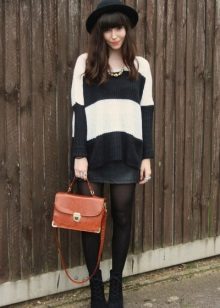 A stripe knit sweater with leather things looks spectacular. It can be a miniskirt, leggings, trousers. This image is suitable for everyday or evening bows.