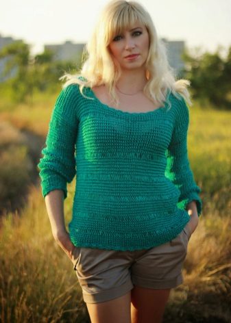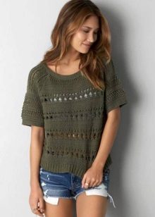 A light knit short sleeve sweater is perfect for cool summer days. It can even be worn with short shorts or under the bottom of a long dress. This is a stylish and unusual model, which is worthy of the wardrobe of a modern fashionista.