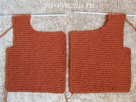- Back. Dial 59 loops and knit 4 rows of 1x1 elastic. Now, knit 35 centimeters of the main fabric with a garter stitch. Place markers at the beginning and at the end of the row to indicate your armhole. Knit another 21 centimeters from them. When you start to knit your shoulders, at the beginning and at the end of the row, remove 5 loops 3 times. When you reduce the first time, close the center 19 loops to get an armhole for the neck. Tie the thread from the new skein and round the neck. To do this, remove 3 loops 3 times from the side.