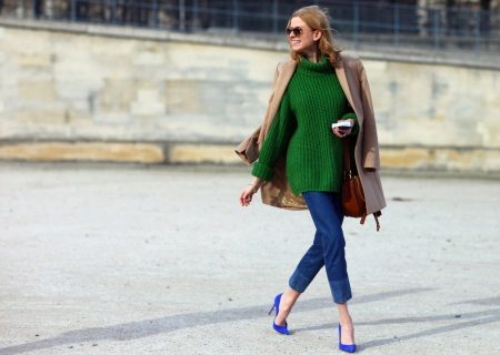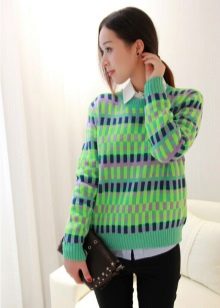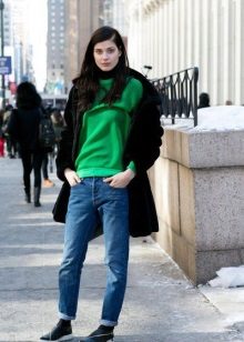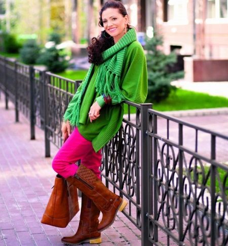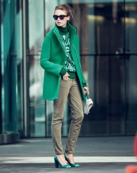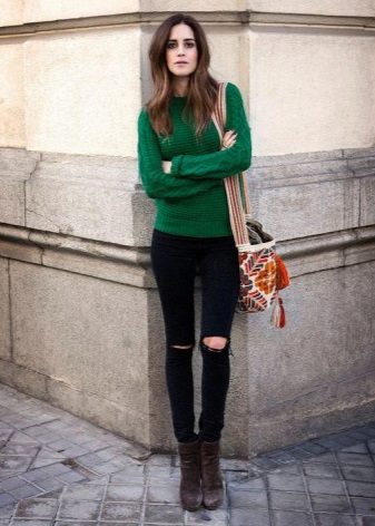 When choosing any of the green sweater models, remember the rule of three colors. Do not overload the image with accessories to stay stylish.