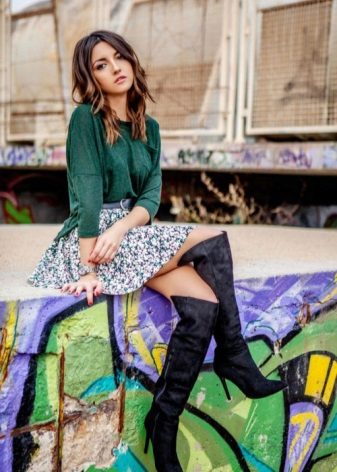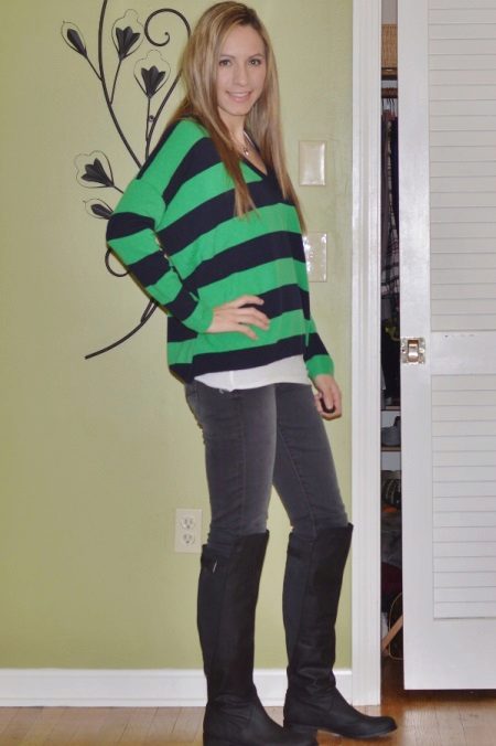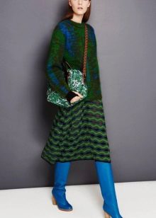 - Gray with green can be an independent element in clothes, for example, boots, a jacket or a skirt, or it can be part of a green sweater in the form of stripes or rhombuses.