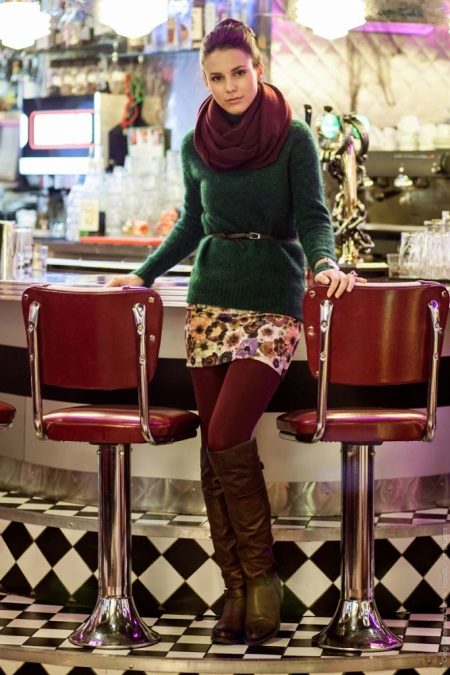 - Red and its shades are a spectacular duet, for example, skinny Bordeaux or pantyhose. Add brown shoes and / or a bag to this set.
