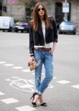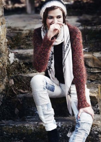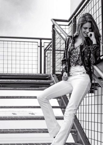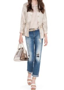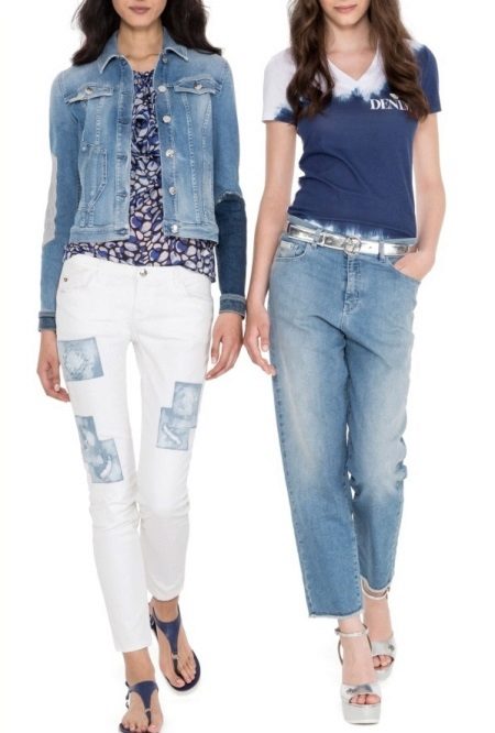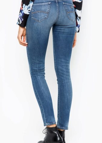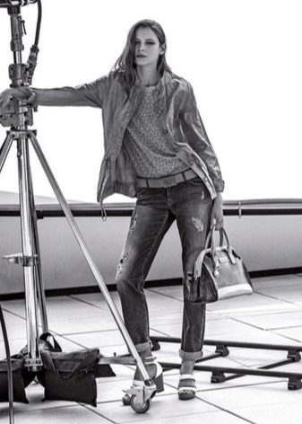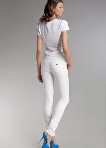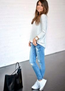 - Light blue or blue slim fit jeans. They look very impressive, thanks to the modern decor - stylish scuffs and holes in the legs.