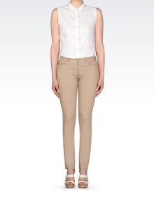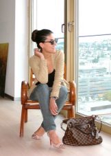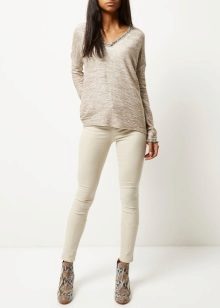 - Beige skinny jeans with modest metal décor on the front pocket. Due to the tight-fitting silhouette and high waistline, they emphasize the advantages of the figure.