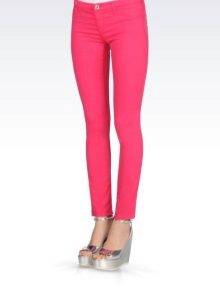 Bright pink skinny jeans will surely attract admiring glances. This model has a low fit and slightly shortened leggings.
