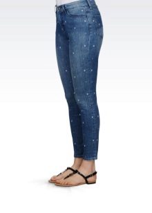 - Straight blue mid-rise jeans. An interesting detail is embroidery in the form of tiny stars scattered across the entire surface of the trousers.
